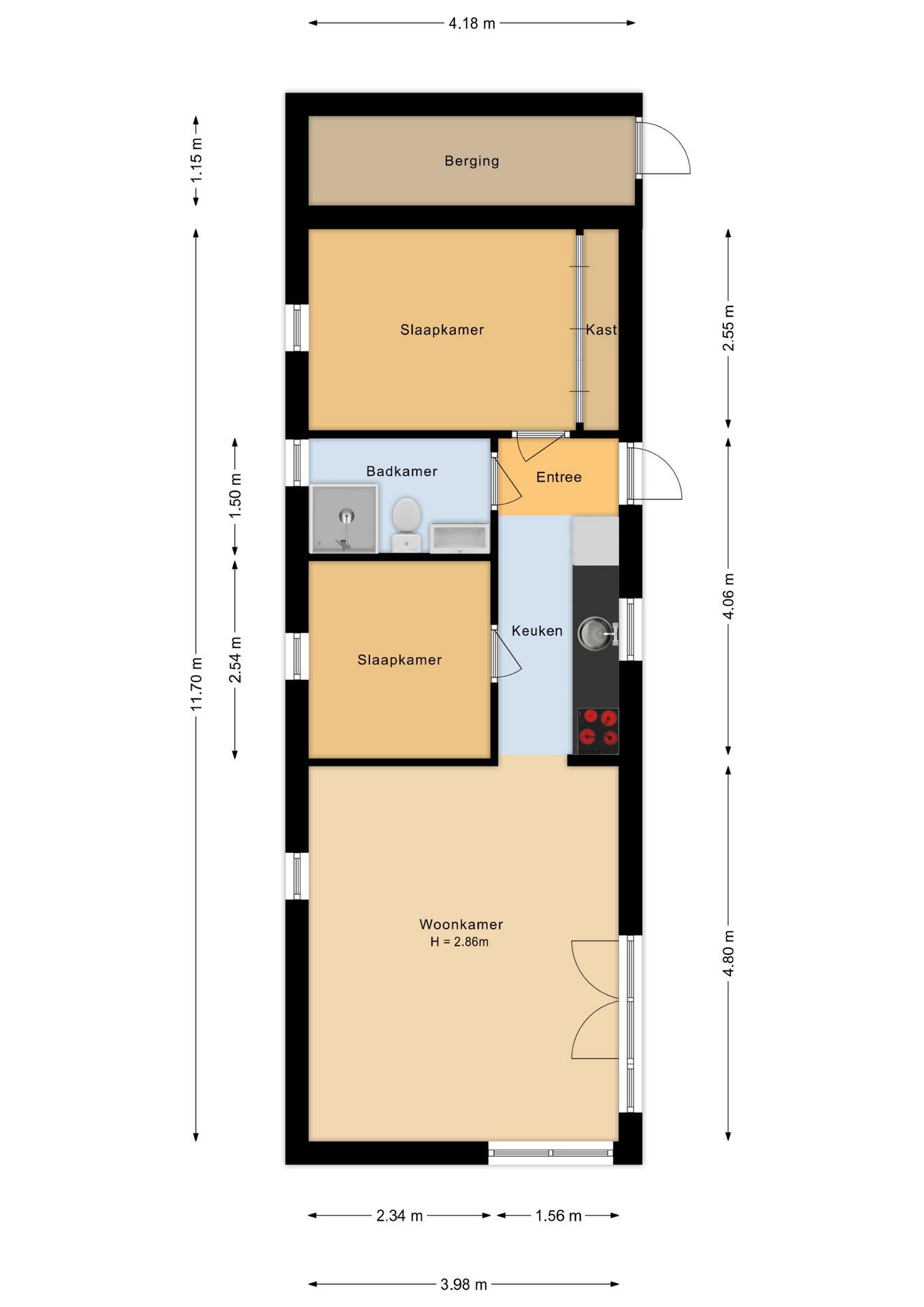 Bij binnenkomst stap je in de entree, waar direct de eerste slaapkamer bereikbaar is. Deze kamer biedt ruimte voor een tweepersoonsbed en beschikt over handige ingebouwde kastruimte. De naastgelegen badkamer is modern uitgevoerd en voorzien van een douche, toilet en een stijlvol wastafelmeubel. Naast de badkamer bevindt zich de tweede slaapkamer.